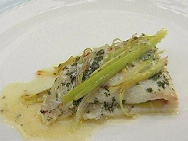 Нежное блюдо из морского языка.Состав:морской язык — 2 штуки;крем-фреш — 2 столовых ложки;петрушка — 1 столовая ложка;сок лайма — 1 столовая ложка;зеленый лук — 1 пучок;масло — 1 столовая ложка;соль, белый перец — по вкусу.
